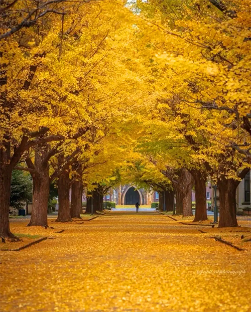 东京大学、明治神宫外苑的银杏大道进入最佳观赏期,街道铺满落叶,成为拍照胜地。